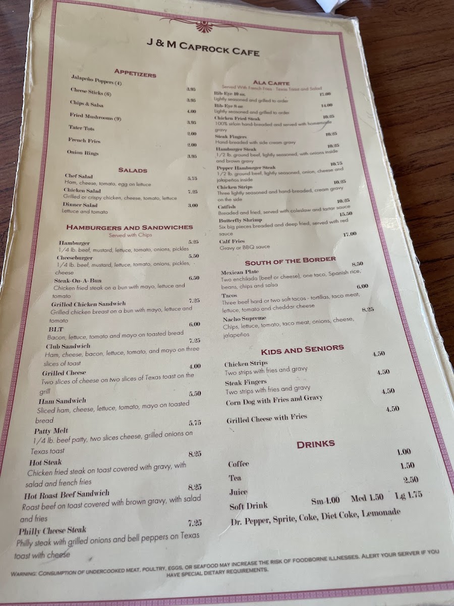 At J & M Caprock Cafe, the menu offers a delightful range of classic, home-style dishes perfect for a casual meal. Located in Dickens, Texas, this charming cafe serves up comfort food with a twist. From hearty breakfast options to satisfying lunch plates, there's something for everyone. The laid-back atmosphere makes it an ideal spot to enjoy favorites like savory burgers, crisp salads, and delicious sandwiches. Whether you're in the mood for a simple yet tasty meal or craving something a bit more filling, the J & M Caprock Cafe Menu is sure to satisfy your appetite. The quality ingredients and friendly service make each visit an enjoyable experience. Perfect for locals and travelers alike, it’s a place where great food and good company come together.